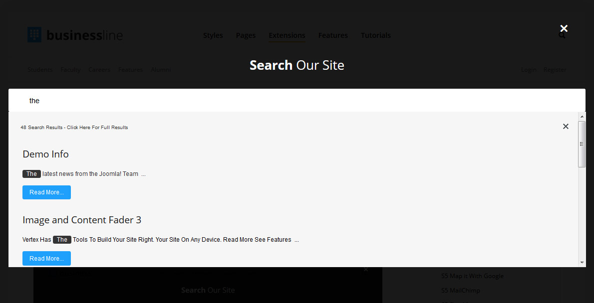 Allow your users to search quickly and without loading or refreshing pages with our amazing ajax search module! Simply publish the module to the 'search' position.
